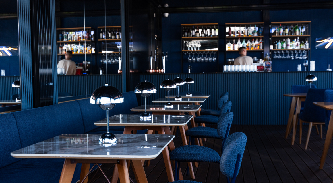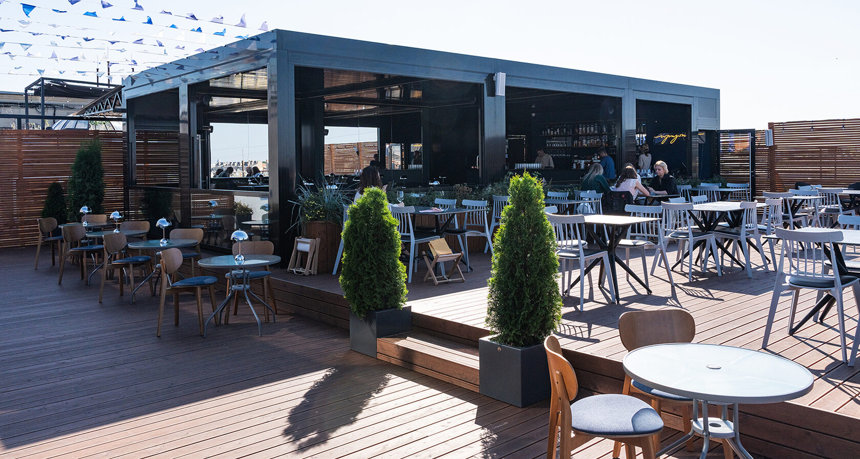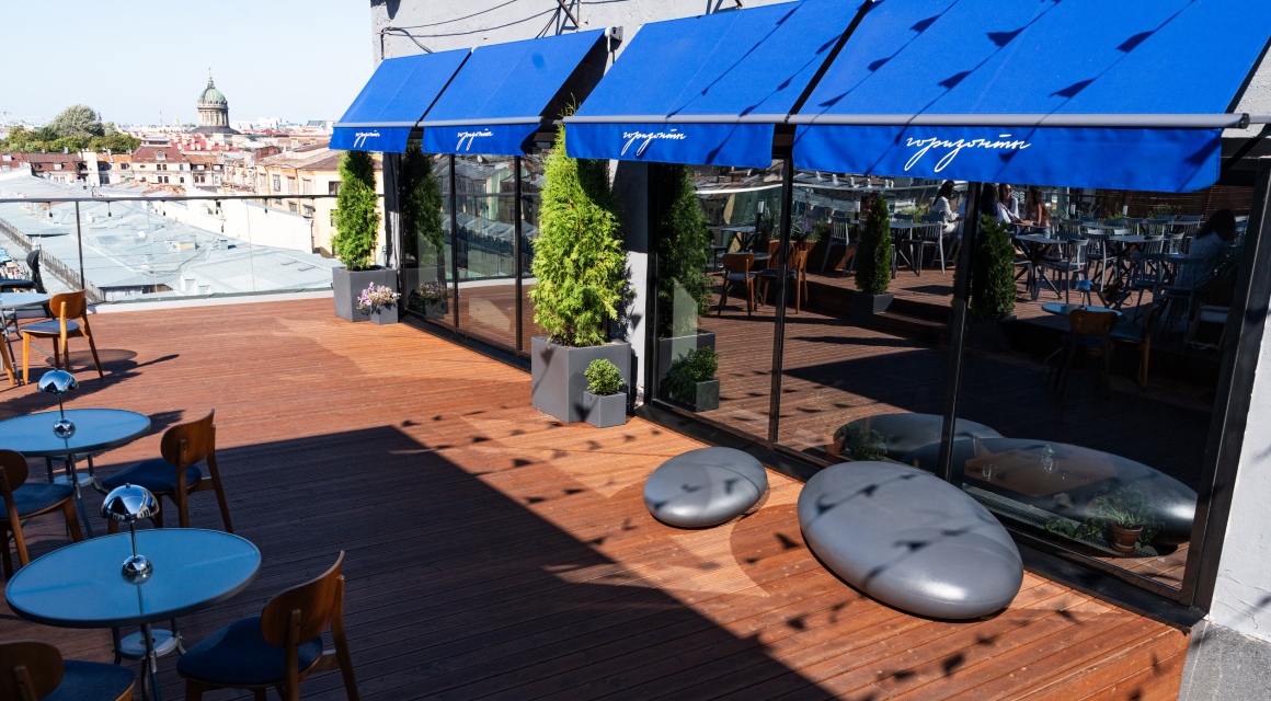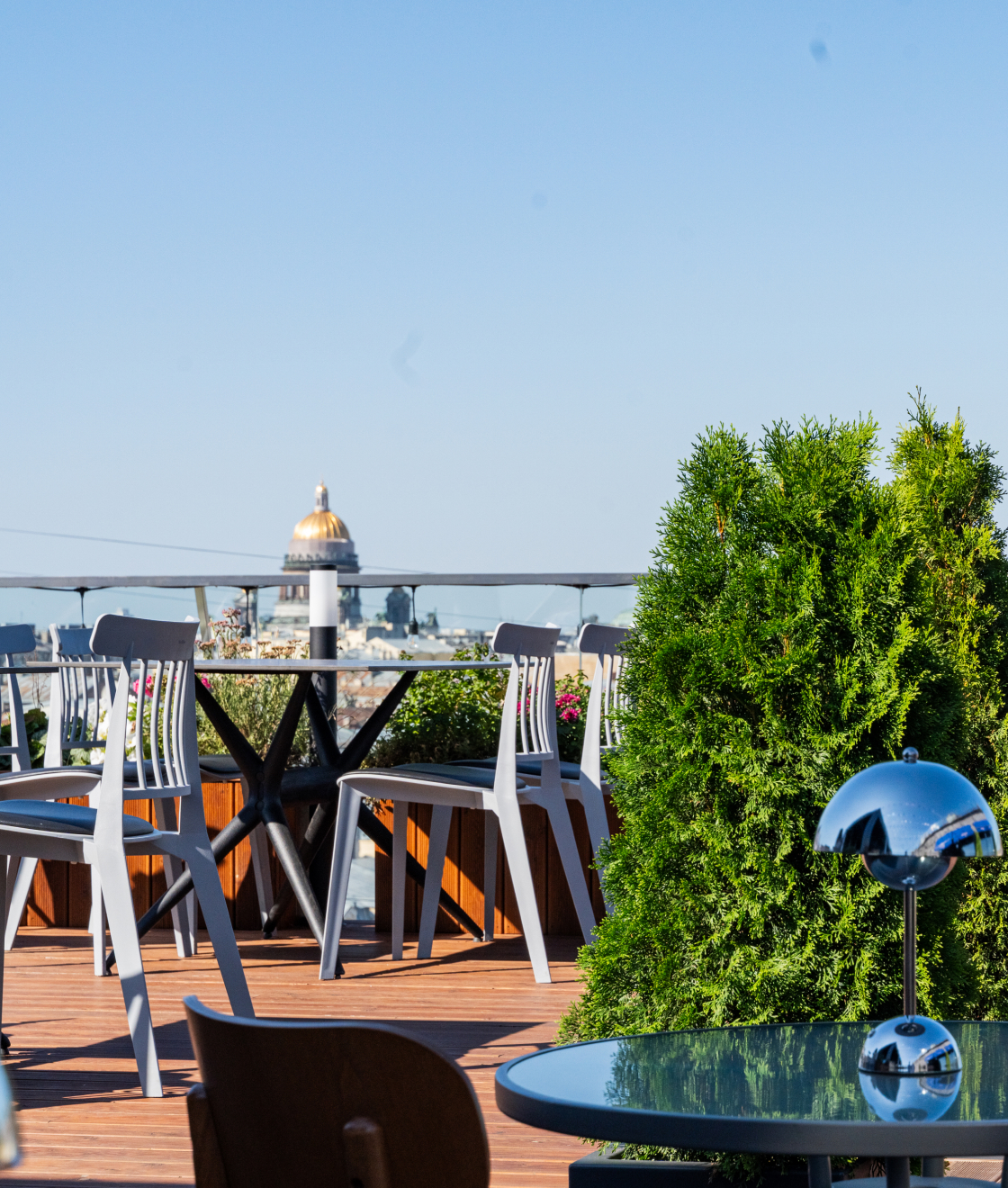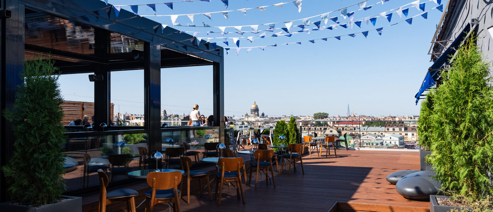 Спроектировать крытую и открытую террасу для видового ресторана на крыше в Санкт-Петербурге. Предоставить комплексное решение, которое подчеркнет статусность проекта и особенности его расположения.